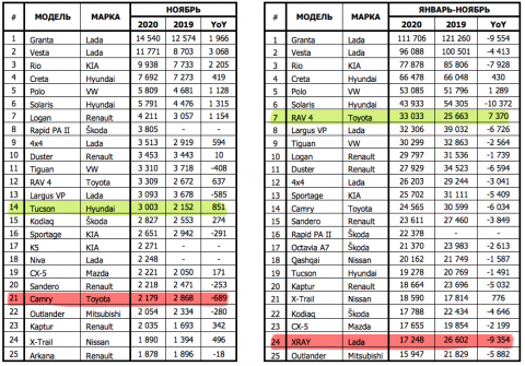Что же касается моделей, подробности можно узнать из топ-25 самых продаваемых новых легковых и лёгких коммерческих автомобилей в России в ноябре и в целом за прошлый и этот год (см. таблицу).