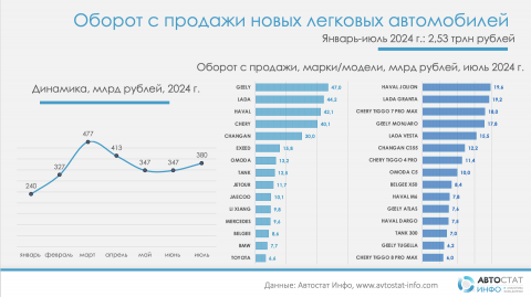 В июле на российском рынке лидировали авторитейлеры Geely (47 млрд руб.). В топ-5 вошли еще Lada (44,2 млрд), Haval (42,1 млрд), Chery (40,1 млрд) и Changan (30 млрд).