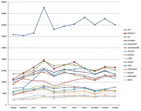 Реальные продажи новых легковых автомобилей в РФ за январь-ноябрь 2013 года